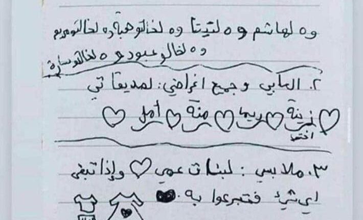Tertulis dalam kertas itu, yang didapat di antara reruntuhan dan puing-puing rumah sakit, “Halo, namaku adalah Hayya, dan aku akan menulis wasiatku saat ini sebagai berikut: Pertama, terkait uangku, 45 shekel untuk ibuku, 5 shekel untuk Ziena, 5 shekel untuk Hasyim, 5 shekel untuk nenekku, 5 shekel untuk Bibi Heiba, 5 shekel untuk Bibi Maryam, 5 shekel untuk Paman Abduh dan 5 shekel untuk Bibi Sarah.