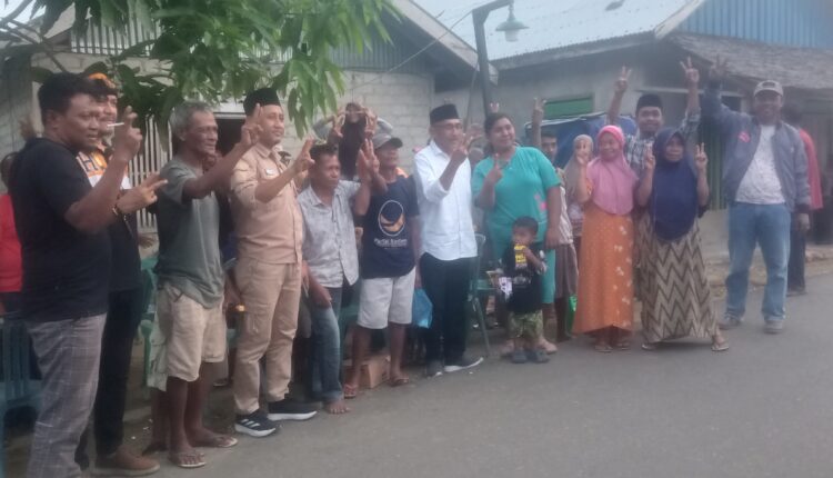 Calon Wakil Bupati Bangkep, Tamin Djopau tiba di Desa Saiyong didampingi ketua DPC PKB Bangkep, Sadat Anwar Bihalia, Ketua DPC Partai Hanura, Jufri Hermawan serta tim lainnya.