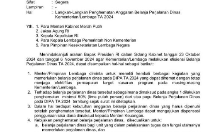 Surat yang bersifat segera ini merupakan tindak lanjut dari arahan Presiden Prabowo Subianto dalam sidang kabinet pada 23 Oktober dan 6 November 2024 untuk meningkatkan efisiensi belanja perjalanan dinas.