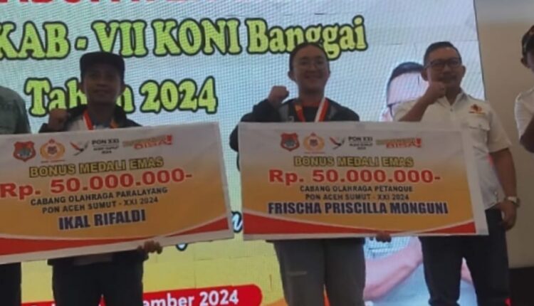 Ada tiga atlet peraih medali. Dua atlet peraih medali emas dan dia atlet peraih medali perunggu. Bonusnya jiga berbeda. Tak hanya atlet, pelatih juga mendapatkan ‘saweran’ bonus dari Ketum KONI Banggai.