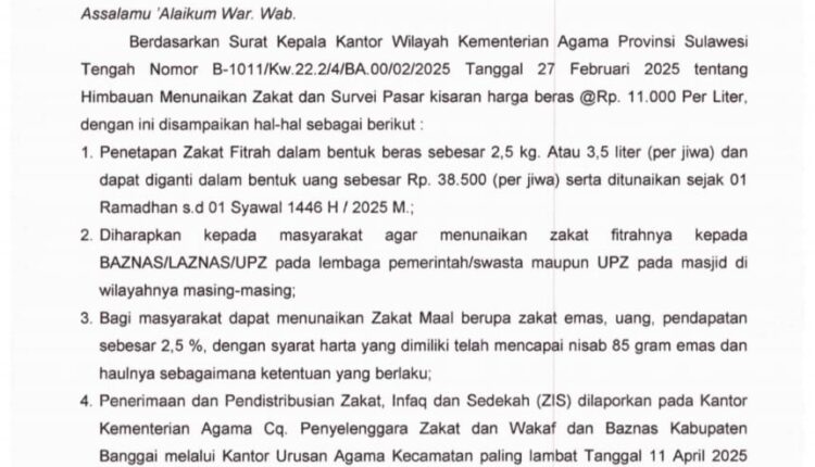 BANGGAI, OKENESIA.COM- Kantor Kementerian Agama (Kemenag) Kabupaten Banggai resmi menetapkan besaran Zakat Fitrah untuk tahun 1446 H / 2025 M.