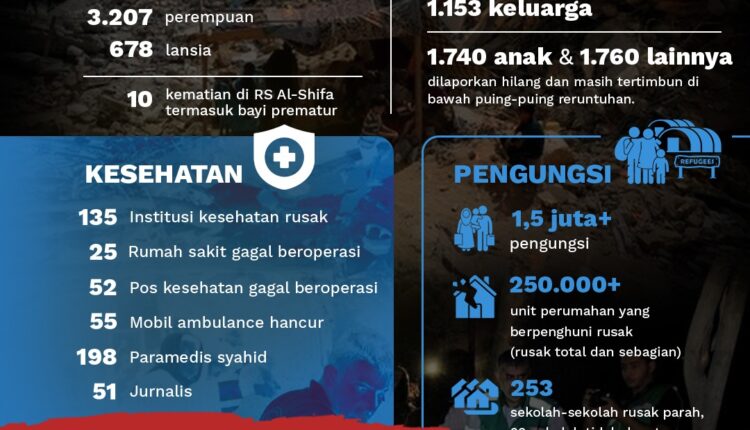 Pendudukan Israel telah membantai 1.153 keluarga, 1.740 anak dan 1.760 lainnya dilaporkan hilang dan masih tertimbun di bawah puing-puing reruntuhan. Sementara, warga setempat tak punya alat berat untuk mengangkat puing-puing gedung yang hancur berantakan.
