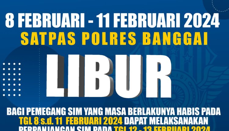 Kasat Lantas, Polres Banggai, AKP I Made Bagus Aditya menyatakan bahwa pelayanan SIM akan diliburkan pada tanggal 8 hingga 11 Februari 2024.