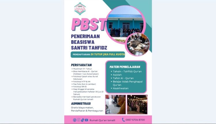 BANGGAI, OKENESIA.COM- Rumah Qur’an Ismaili membuka penerimaan beasiswa santri tahfidz. Pendaftaran sudah mulai dibuka mulai sekarang. Penerimaan beasiswa santri tahfidz itu akan ditutup apabila sudah memenuhi kuota.