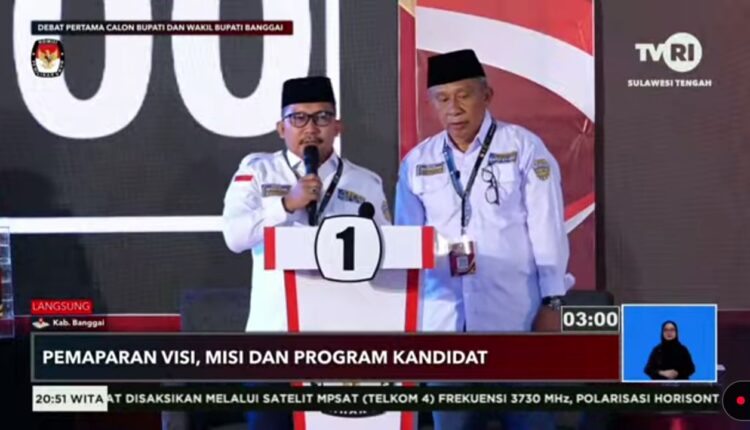 BANGGAI, OKENESIA.COM- Calon Bupati Banggai Amirudin Tamoreka bersama pasangannya, Furqanuddin, menguraikan visi dan misi mereka dalam debat publik putaran pertama yang berlangsung di Hotel Estrella, Luwuk, Senin (28/10/2024).