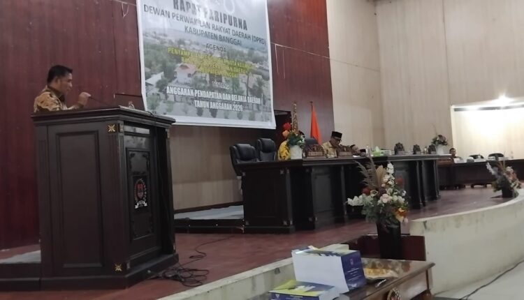 Nota pengantar keuangan disampaikan Bupati Banggai yang dibacakan Sekretaris Kabupaten Ramli Tongko dalam rapat paripurna yang dipimpin Ketua DPRD Banggai Saripudin Tjatjo, didampingi Wakil Ketua I, I Putu Gumi, di Graha Dongkalan, Selasa (25/11/2025).