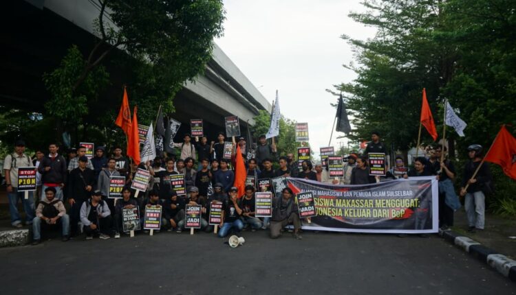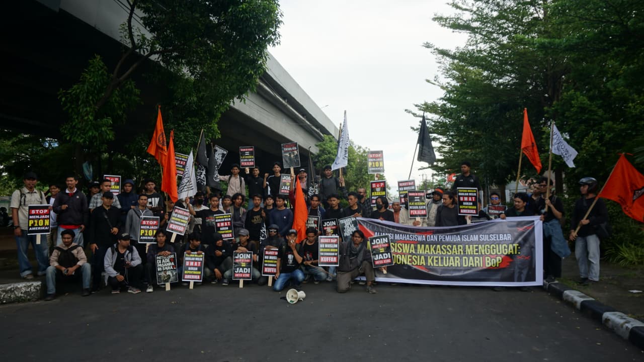 MAKASSAR, OKENESIA.COM- Gelombang protes mahasiswa kembali memadati jalanan Fly Over di Kota Makassar. Ratusan massa yang tergabung dalam Aliansi Mahasiswa Pemuda Islam Sulselbar (AMPIS) menggelar aksi damai menuntut pemerintah Indonesia segera menarik diri dari keanggotaan Board of Peace (BoP).